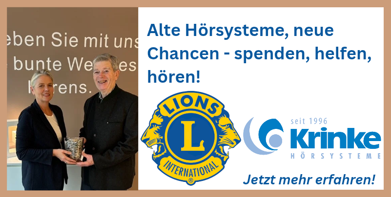 Der Lions Club engagiert sich schon seit Jahrzehnten für soziale Projekte, wie das Sammeln von alten Hörsystemen. Wir von Krinke Hörsysteme unterstützen den Lions Club hierbei und sind mit unseren Filialen Anlaufstelle für alte, nicht mehr benötigte Hörsysteme. Diese werden vor Ort entweder wiederaufbereitet oder für die Teilverwertung vorbereitet.